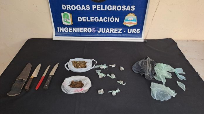 Efectivos de la fuerza provincial realizaron dos allanamientos en los barrios 8 de Marzo de esta ciudad y 50 Viviendas de la localidad de Ingeniero Juárez, donde secuestraron marihuana, cuchillos, elementos de almacenamiento, un teléfono celular, dinero y detuvieron a dos sujetos.