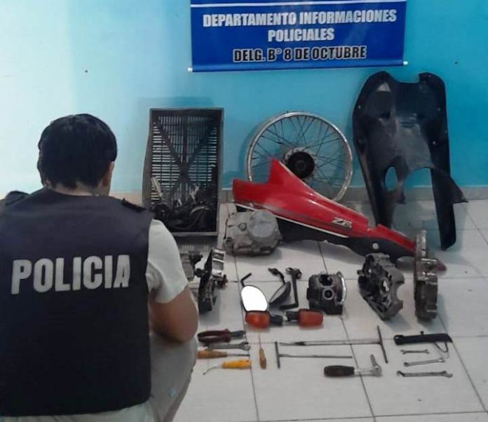 Efectivos del Departamento Informaciones Policiales, Delegación 8 de Octubre, detuvieron a un sujeto y secuestraron motopartes, herramientas, entre otros elementos, durante el allanamiento de una vivienda del barrio Juan Domingo Perón de esta ciudad.