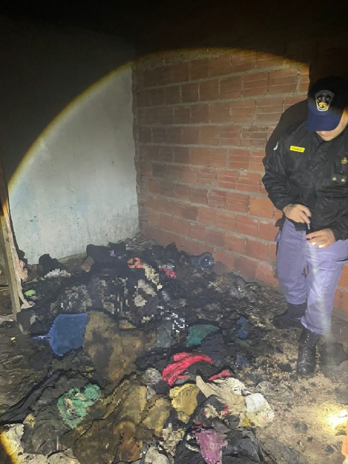 Al ingresar al inmueble, constató una intensa emanación de humo proveniente de una de las habitaciones, donde varias prendas de vestir estaban cubiertas de llama.