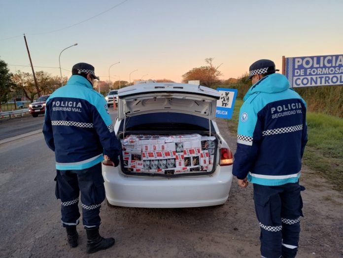 Efectivos de la fuerza provincial detuvieron a un hombre y una mujer que trasladaban un cargamento de cigarrillos ingresados por pasos no habilitados al país, en un automóvil Chevrolet Classic blanco.