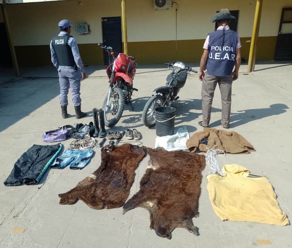 Como resultado, se secuestraron dos motocicletas, zapatillas, alpargatas, prendas de vestir con manchas de sangre y restos de grasa, un machetillo, una linterna, una balanza portátil, un cuero de animal vacuno, entre otros elementos de interés en la causa.