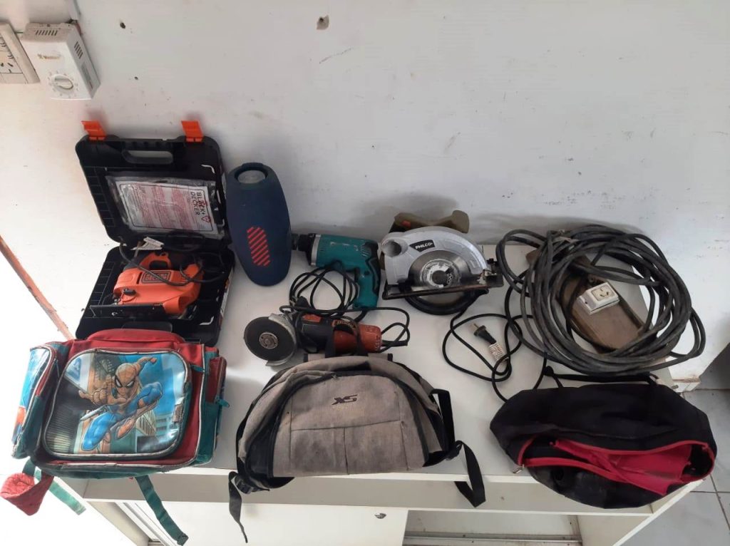 En esa intervención secuestraron una sierra caladora con estuche, una amoladora con protector de seguridad y disco de corte, un taladro, un alargue, una sierra circular, dos mochilas, un bolso y un parlante inalámbrico.