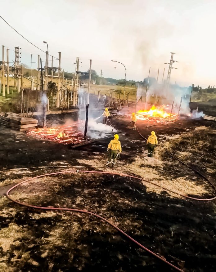 En ese lugar, se encontraron con un incendio de pastizal de grandes dimensiones que se propagaba rápidamente por los fuertes vientos, hacia postes apilados en el predio de la planta de REFSA, iniciándose rápidamente las tareas de extinción.