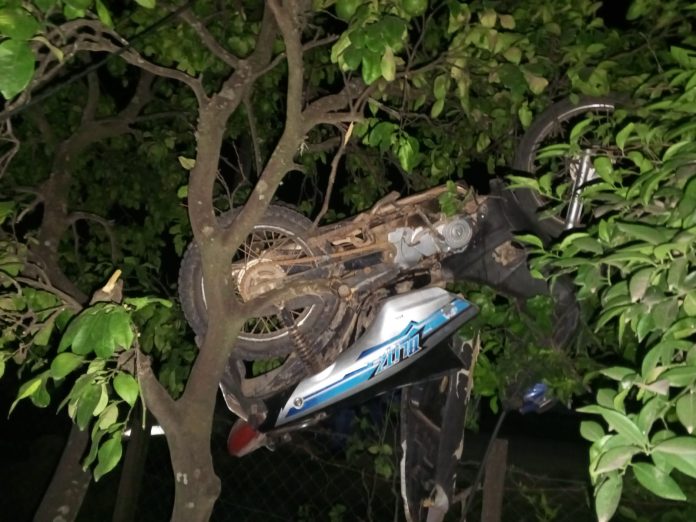 Luego, colisionó contra un poste de mampostería de alimentación eléctrica y un árbol, donde la motocicleta quedó sostenida entre las ramas de un árbol.