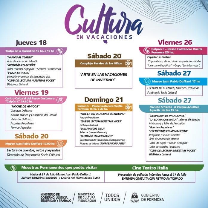 La Subsecretaría de Cultura, dependiente del Ministerio de Cultura y Educación, en forma conjunta con el Ministerio de Gobierno, Justicia, Seguridad y Trabajo, dio inicio a “Cultura en Vacaciones”, una propuesta de acceso libre y gratuito, para disfrutar en familia durante el receso invernal 2024